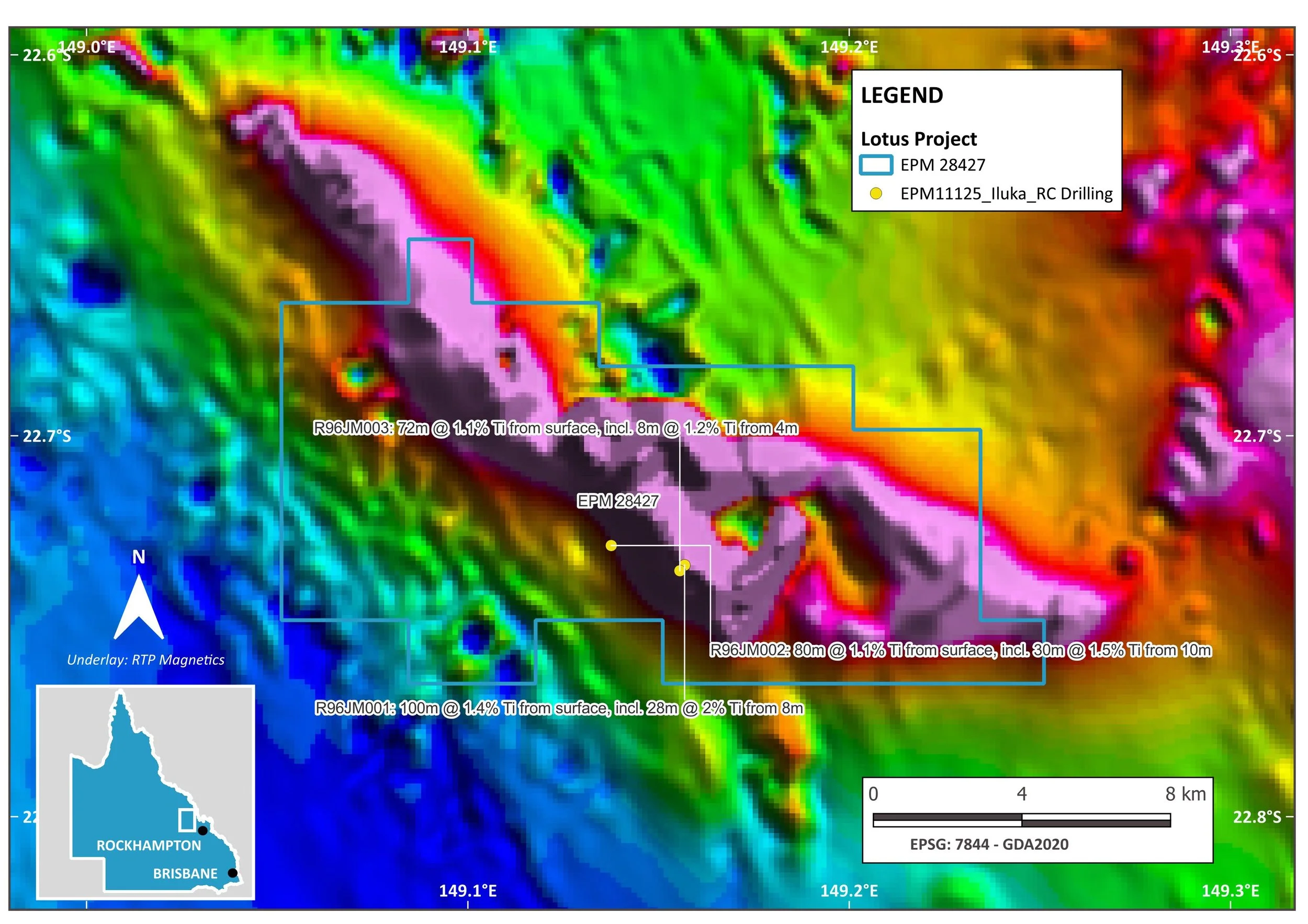 Lotus Regional RTP Magnetics showing the large zoned intrusive complex and the Iluka drillholes