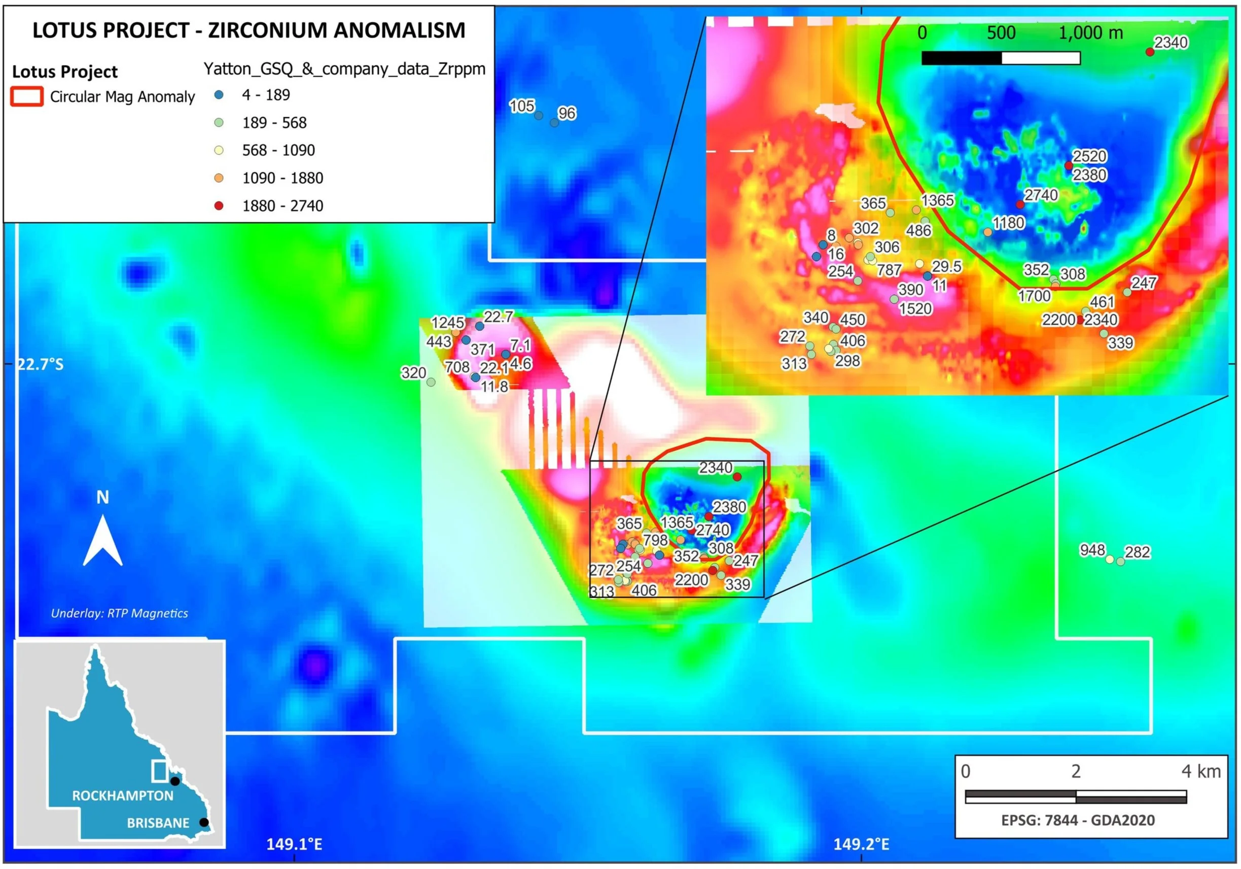 Lotus Detailed RTP Magnetics and Zirconium Anomalism (Zirconium up to 2740ppm within the circular magnetic low)